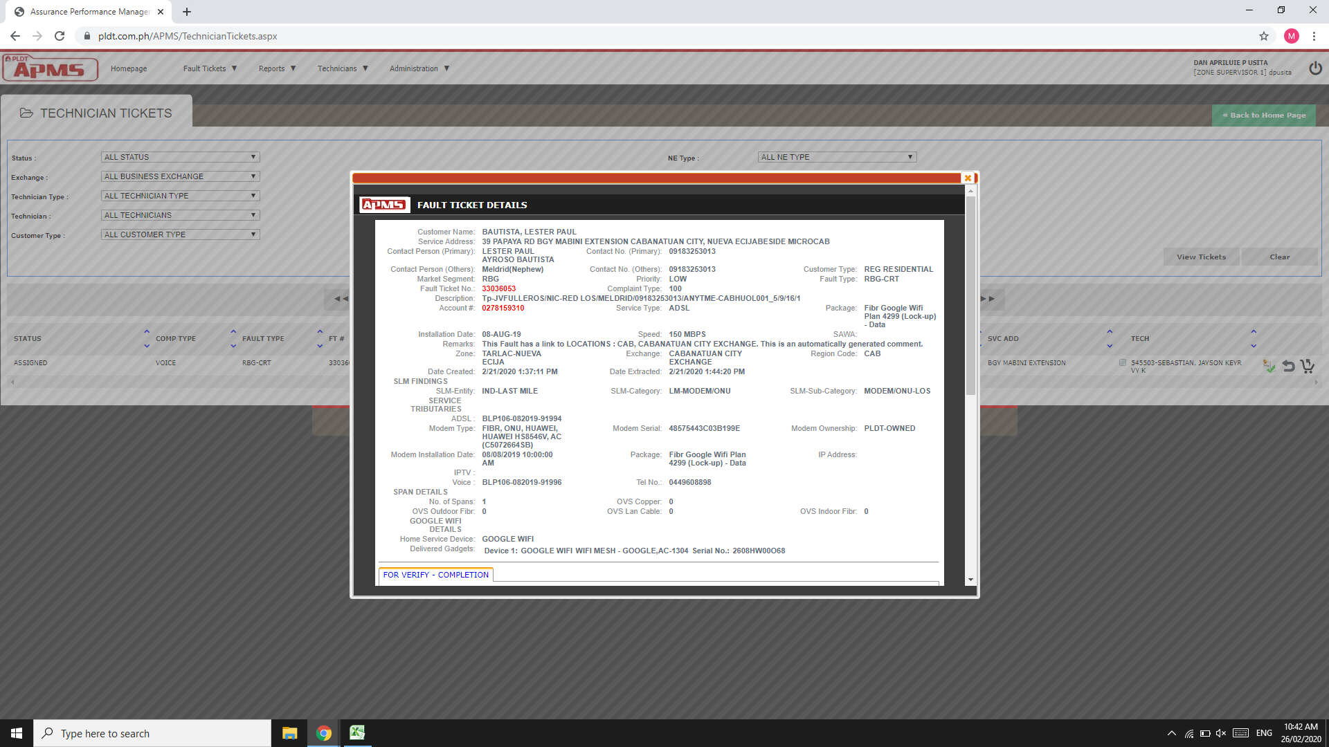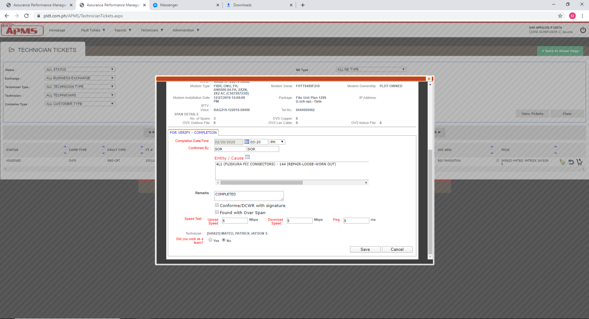Im assigning the technician to repair the reports of the subscribers and check the vacant ports of cabinet 13